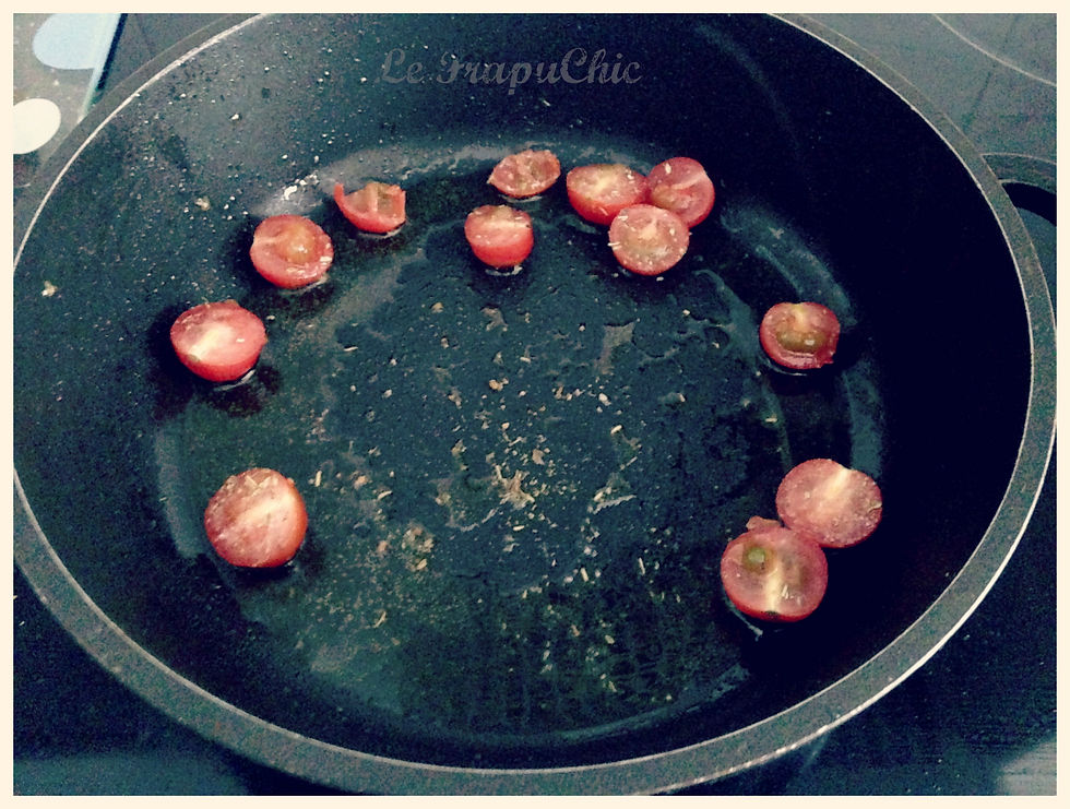 On a pan preheated we pour the olive oil and wait 3 minutes then we fry the cherry tomatoes on halved with the cooking herbs.